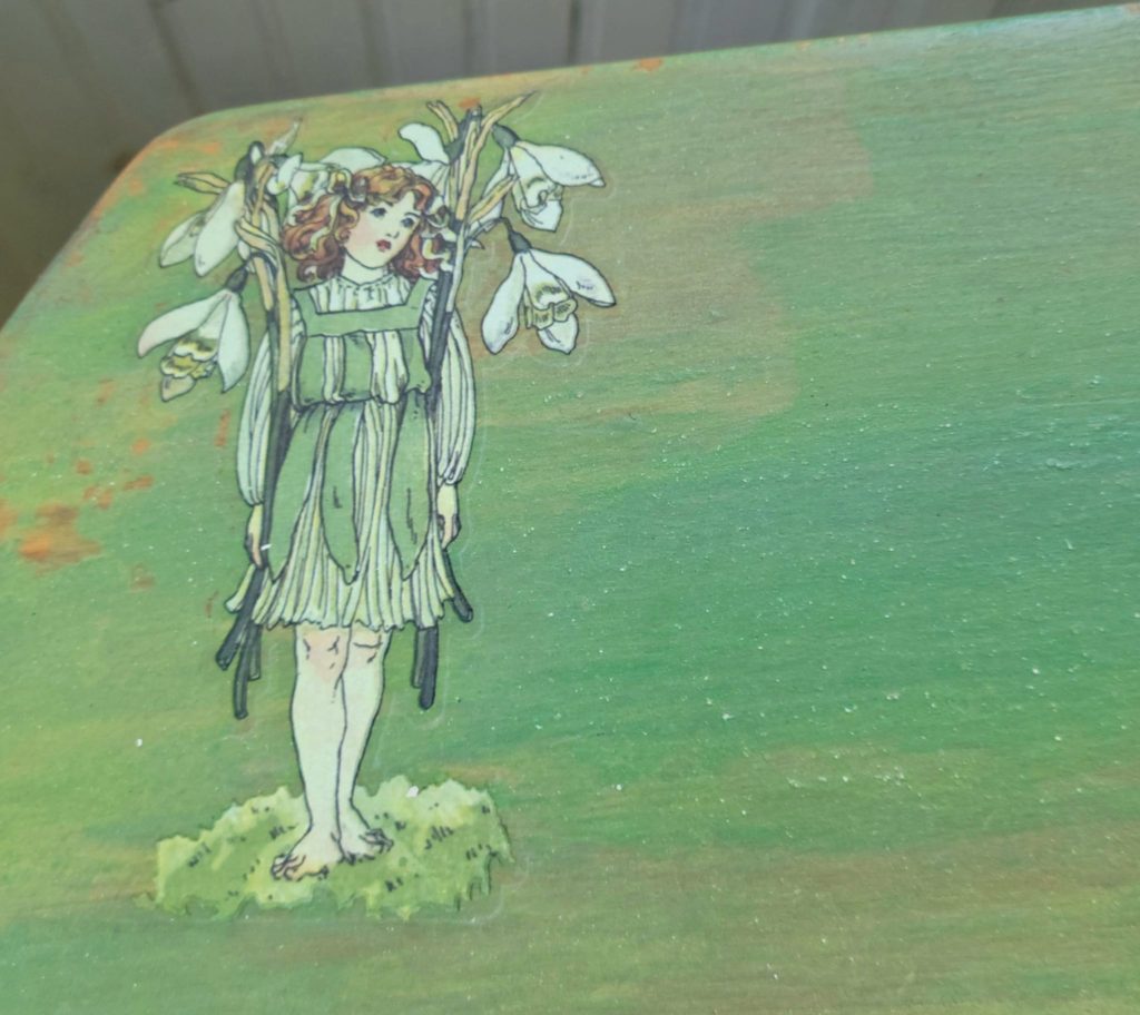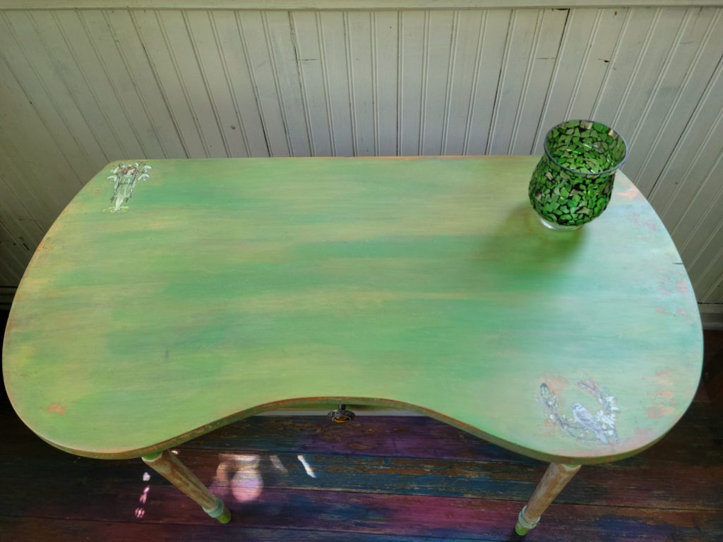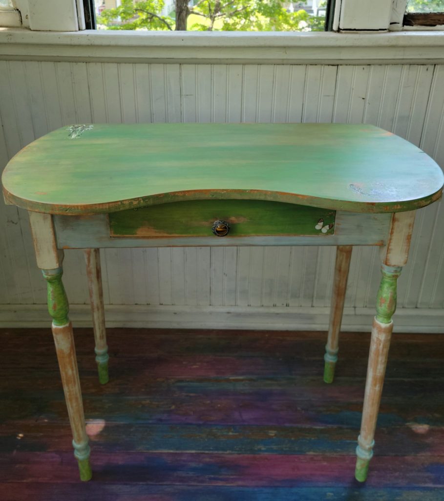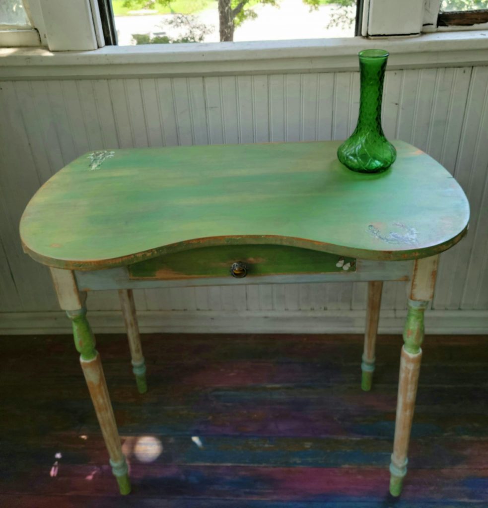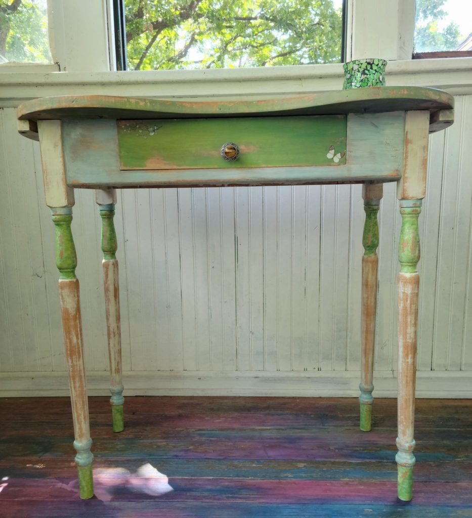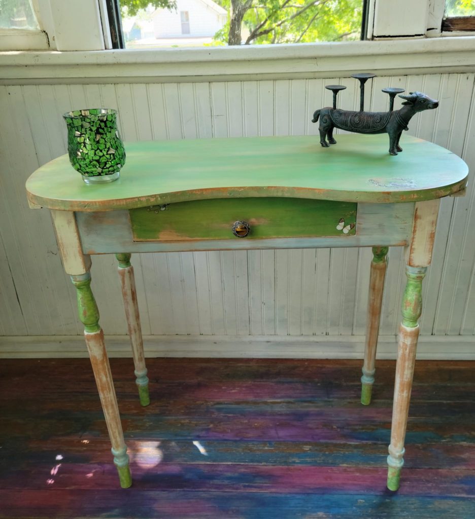 Presenting Miss Chloe. This girl makes my heart super happy! She started life as a 1920’s or 30’s skirted vanity/dressing table. I think she would make a most excellent accent piece for just about any room. I can see her living happily in an entranceway, a hallway, a bedroom… She’s absolutely lovely. And versatile! Her previous person had started to refurbish her and got her down to the bare wood which was beautiful and a genuine joy to work with. I wanted to feature that wood, but also wanted to see her in a bit of finery.