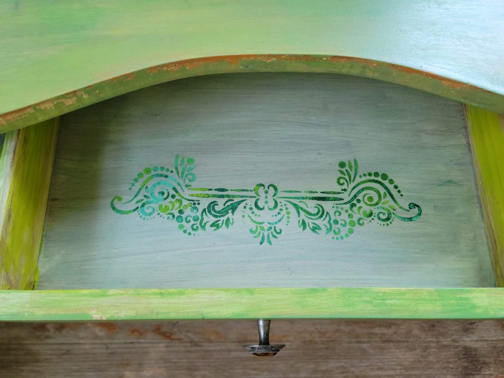 She’s dressed in homemade, hand tinted, milk paints. (Stencil and drawer sides done in a combo of the same milk paints and a few homespun mineral paints.) Sealed with a couple coats of poly for durability and a top coat of lightly hand tinted wax.